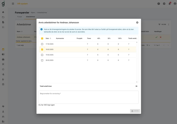 Personen som er valgt til å håndtere forespørsler vil finne dem under menyvalget Forespørsler. Her kan ansvarlig se alle timene som den ansatte har sendt inn, og ved å klikke på et av godkjennings- eller avvisningsikonene vil alle detaljer fra de enkelte dagene være synlige. Når du ser detaljene for de enkelte registreringene kan du huke på eller fjerne merket for registreringene du ikke ønsker å godkjenne eller avvise. Ved å gjøre dette vil timene som ikke er krysset av forbli i listen, slik at du for eksempel kan godkjenne alle timeregistreringer unntatt én, som du deretter kan avvise i stedet.