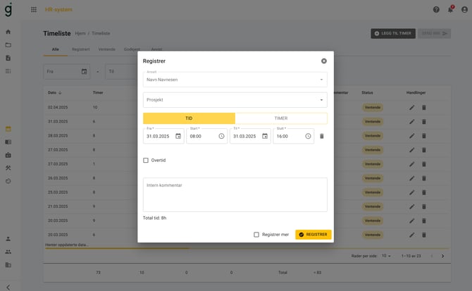 Dersom dere har tatt i bruk timeregistrering i HR-systemet, kan hver ansatt registrere arbeidstiden på to forskjellige steder. Dette kan gjøres under menyvalgene Personlig kalender og Timeliste.