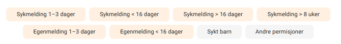 Nedarbingumo dienos – rodo nedarbingumo dienų skaičių dėl nedarbingumo. Čia galite matyti bendrą skaičių ir skaičių pagal tipą; medicininę pažymą ir savarankišką patvirtinimą. Šios nedarbingumo dienos apskaičiuojamos taip pat, kaip ir bendras nedarbingumo dienų skaičius darbuotojams, turintiems skirtingą pareigų procentą. Jei yra nedarbingumas, taip pat įtraukiamas nedarbingumo atostogų procentas. Darbuotojas, dirbantis 50 % ir nedarbingas 5 dienas, gauna 20 % nedarbingumo atostogų, todėl turi 0,5 dienos nedarbingumo atostogų.