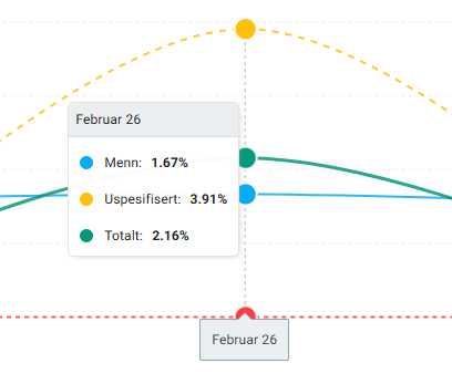 Grafike parodyta, kaip keitėsi nedalyvavimo procentas kiekvieną mėnesį. Skirtingos grafiko linijos rodo skirtingų lyčių pokyčius. Virš grafiko esančiose kategorijose galite matyti, kurias lytis atitinka skirtingos spalvos. Galite kontroliuoti, kurias eilutes norite matyti, spustelėdami kategorijas, kad paslėptumėte arba rodytumėte pasirinktą eilutę.