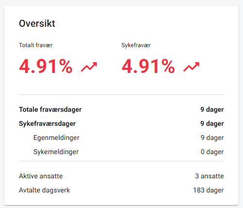Viso nedarbingumo dienų skaičius – rodo bendrą nedarbingumo dienų skaičių pasirinktu laikotarpiu ir pasirinktu skyriumi / darbuotoju. Spalva ir rodyklė rodo, ar nedarbingumas yra didesnis, mažesnis ar toks pat, palyginti su ankstesniu laikotarpiu. Jei filtruojate pagal ketvirtį, jis lyginamas su ankstesniu ketvirčiu, o jei filtruojate pagal metus, jis lyginamas su visais praėjusiais metais. Čia procentinė dalis rodoma su 2 skaitmenimis po kablelio, todėl jei nedarbingumas yra mažesnis nei 0,005 %, jis bus rodomas kaip 0 %.