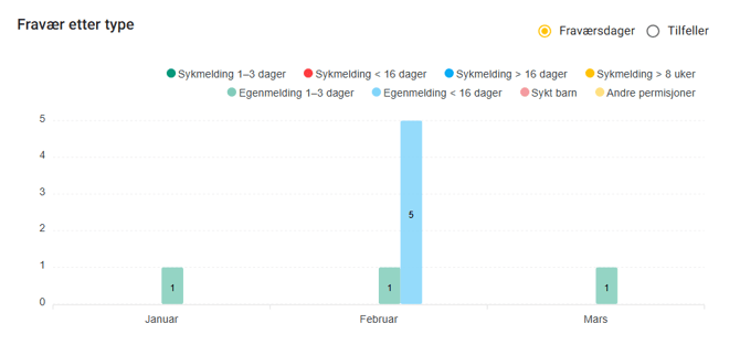 Paspaudę radijo mygtukus virš diagramos, galite pasirinkti, ar stulpeliuose turėtų būti rodomas nedarbingumo dienų skaičius, ar atvejų skaičius. Atvejis laikomas tęstiniu to paties tipo nedarbingumu. Kalendoriuje galėjo būti atliktos kelios skirtingos registracijos, tačiau jei visos registracijos yra to paties tipo ir tarp registracijų nėra darbo dienų, jos laikomos vienu atveju. Nedarbingumo dienos skaičiuojamos taip pat, kaip aprašyta skyriuje „Apžvalga“, ir priklauso nuo darbuotojų užimtumo procento ir nedarbingumo procento.